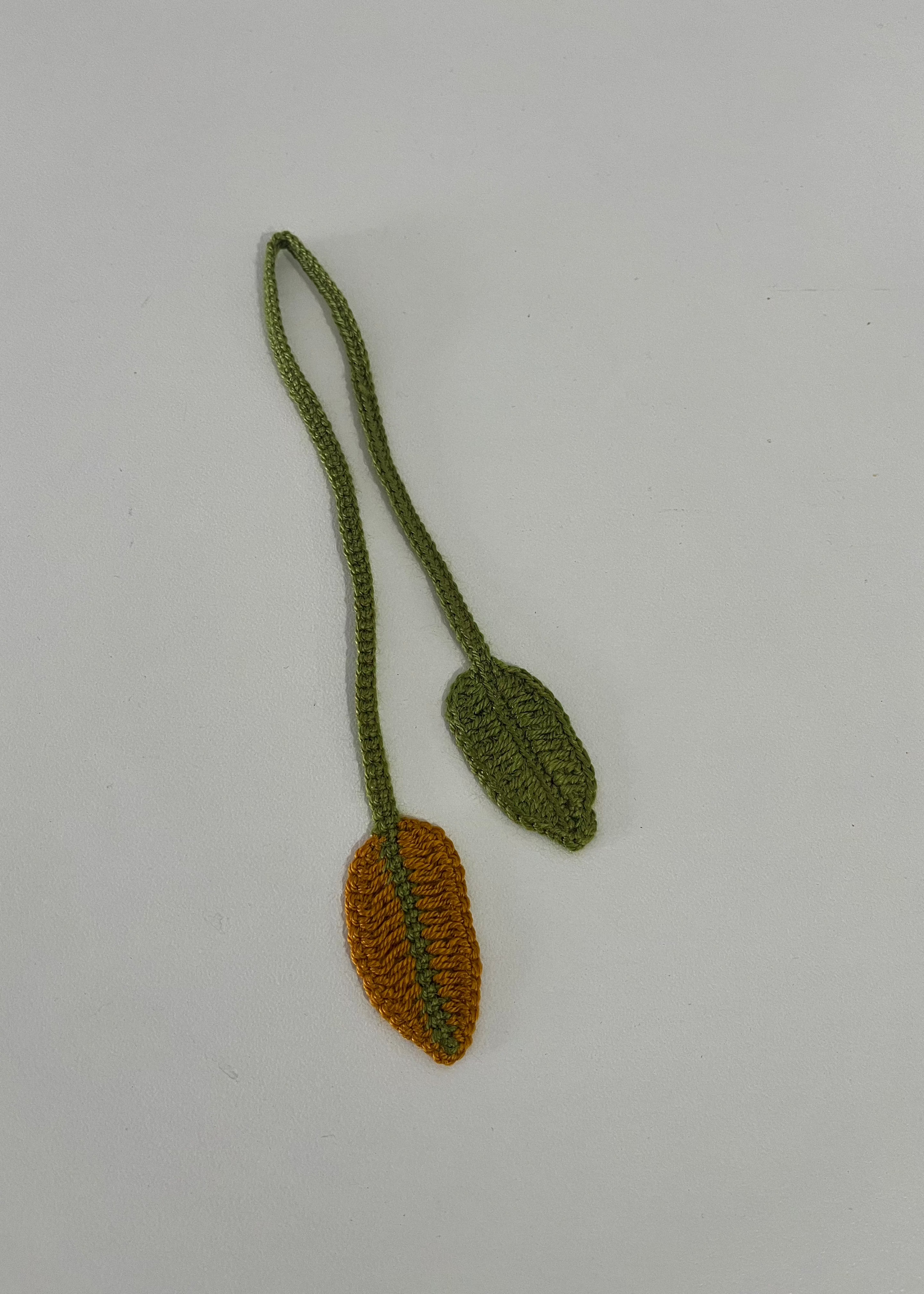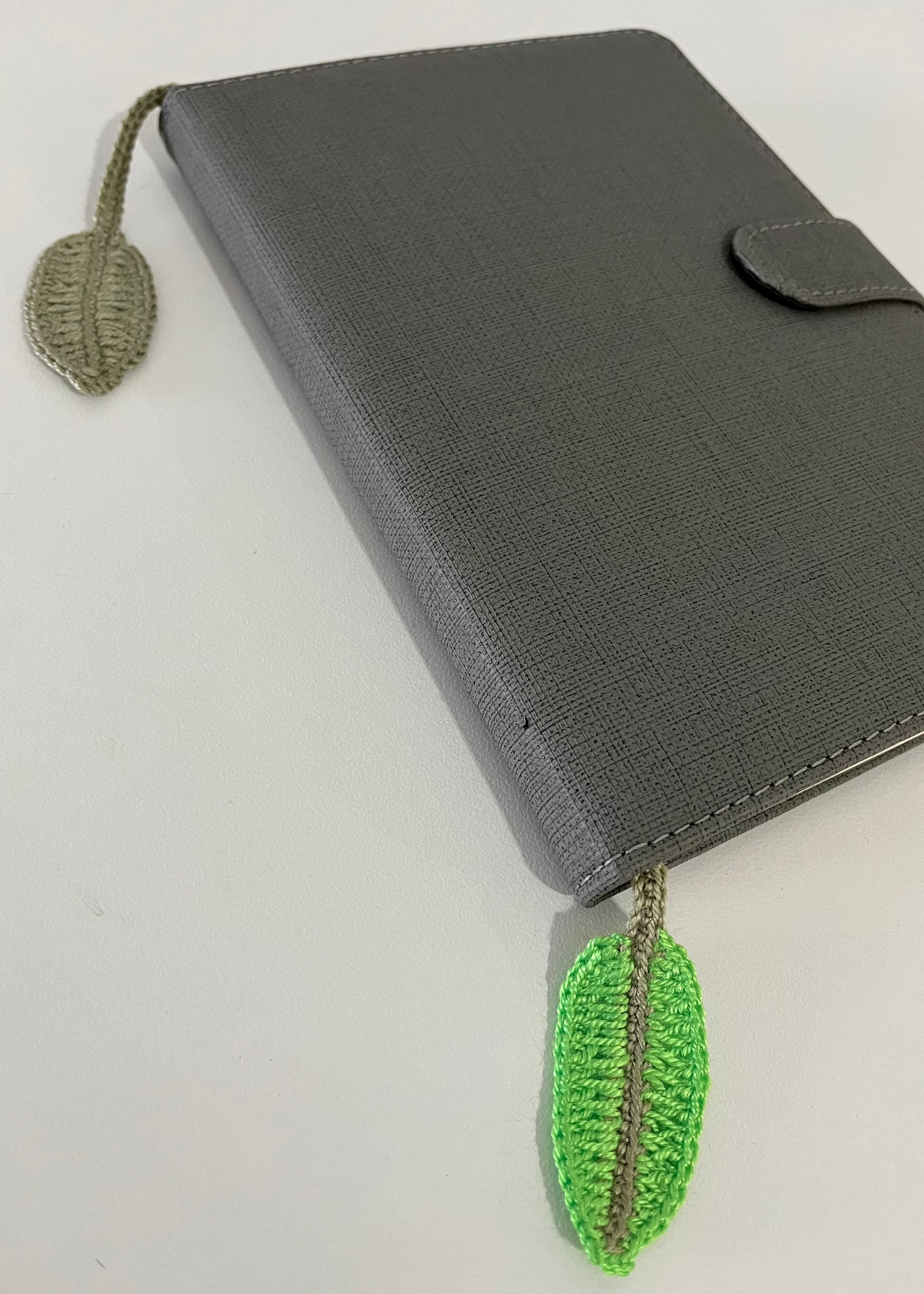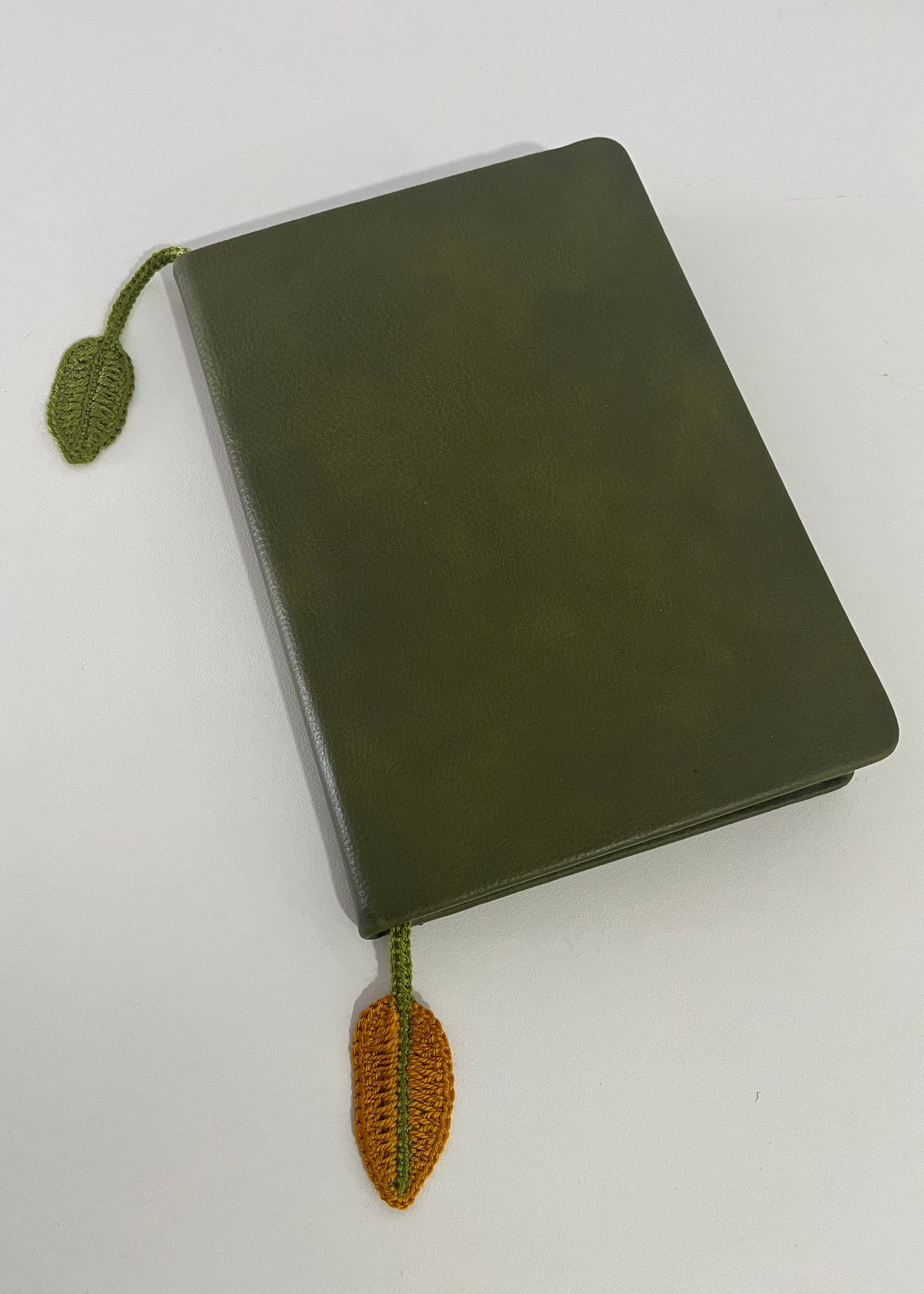 A leaf design crochet bookmark to help you keep track of your page as you leaf through the pages.