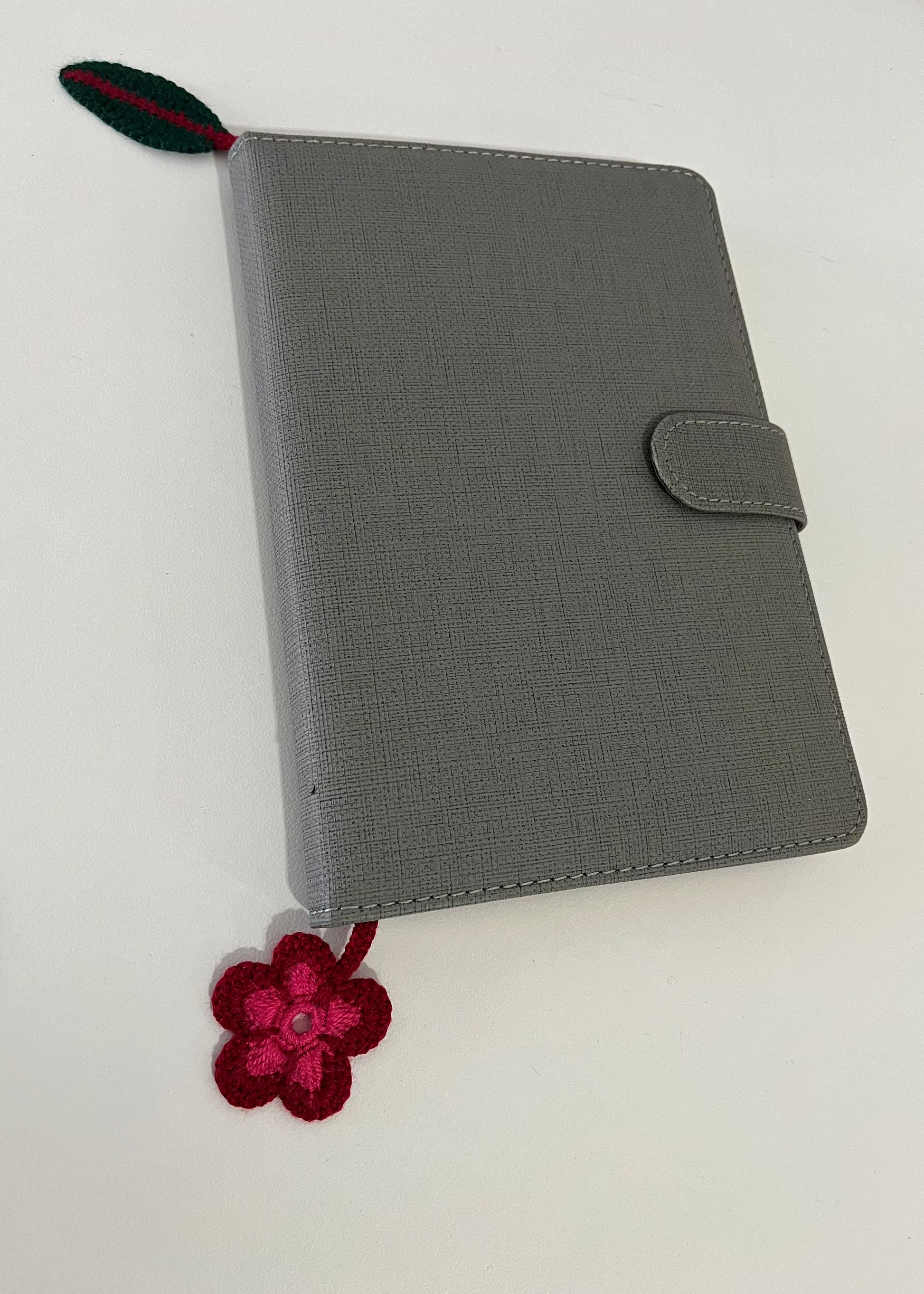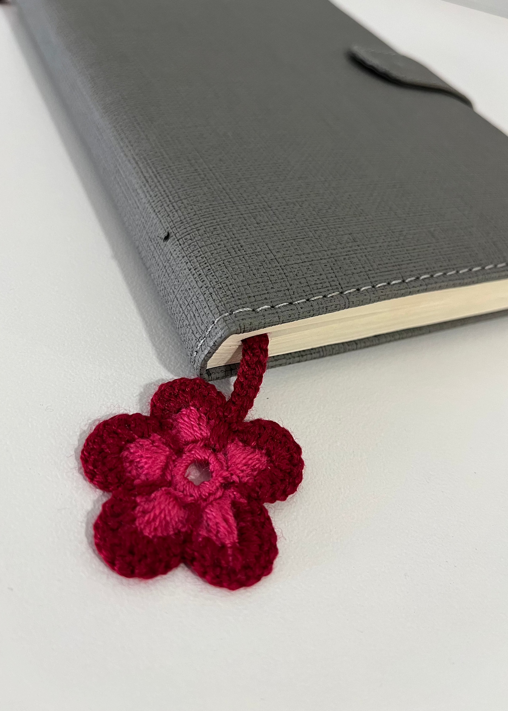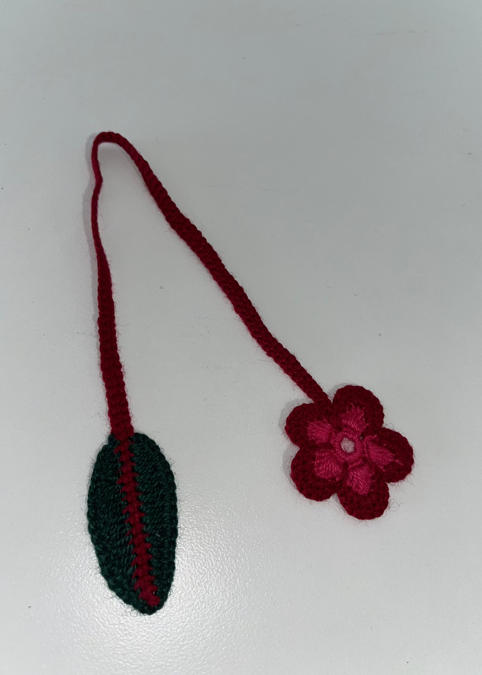 A flower and leaf design crochet bookmark to help you keep track of your page as you leaf through the pages.